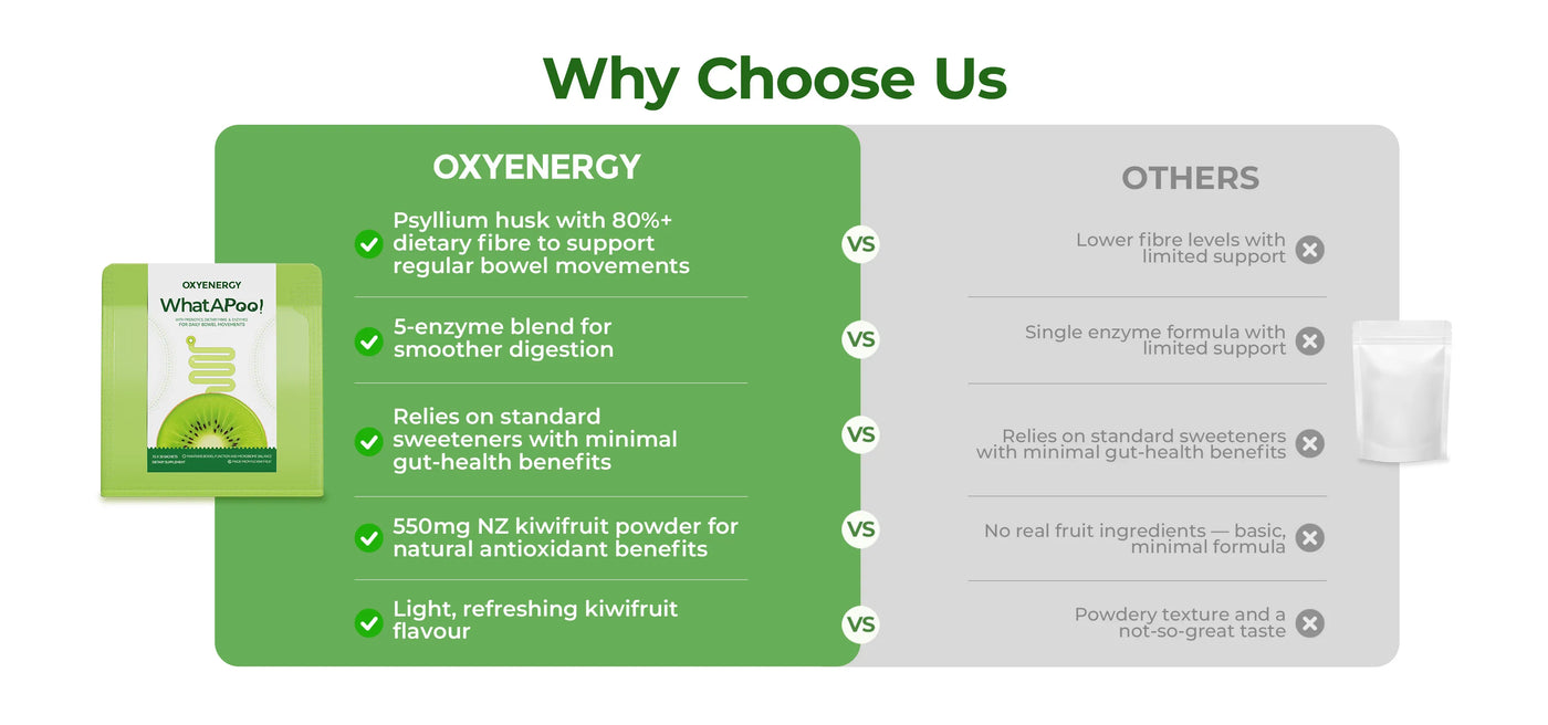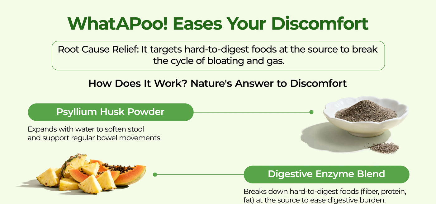 WhatAPoo! is a premium digestive support supplement with prebiotics, dietary fibre and digestive enzymes, carefully designed to support gentle digestion and natural bowel movements. Ideal for anyone wanting everyday digestive wellness and a healthy gut microbiome.