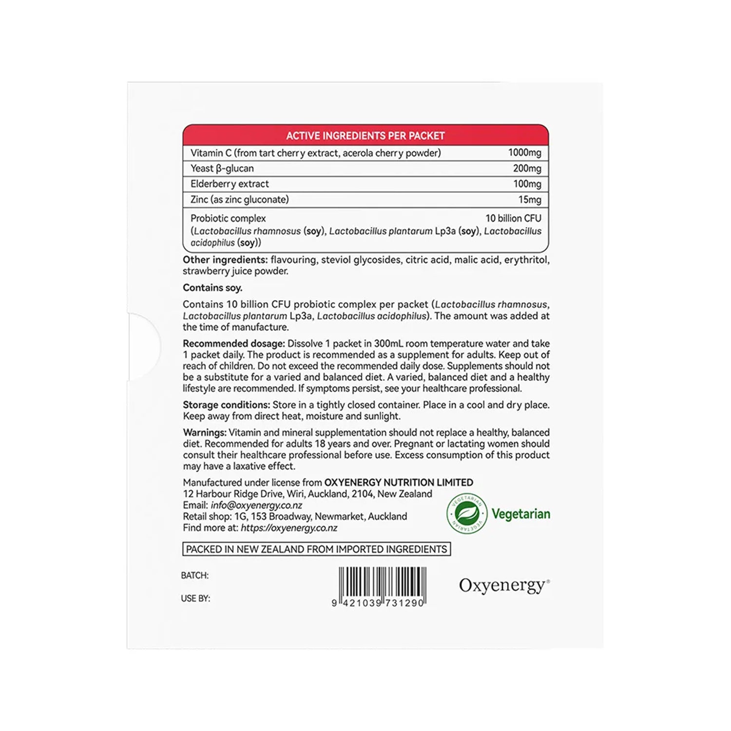 Contains 10 billion CFU probiotic complex per packet (Lactobacillus rhamnosus, Lactobacillus plantarum Lp3a, Lactobacillus acidophilus). The amourt was added at the time of manufacture.