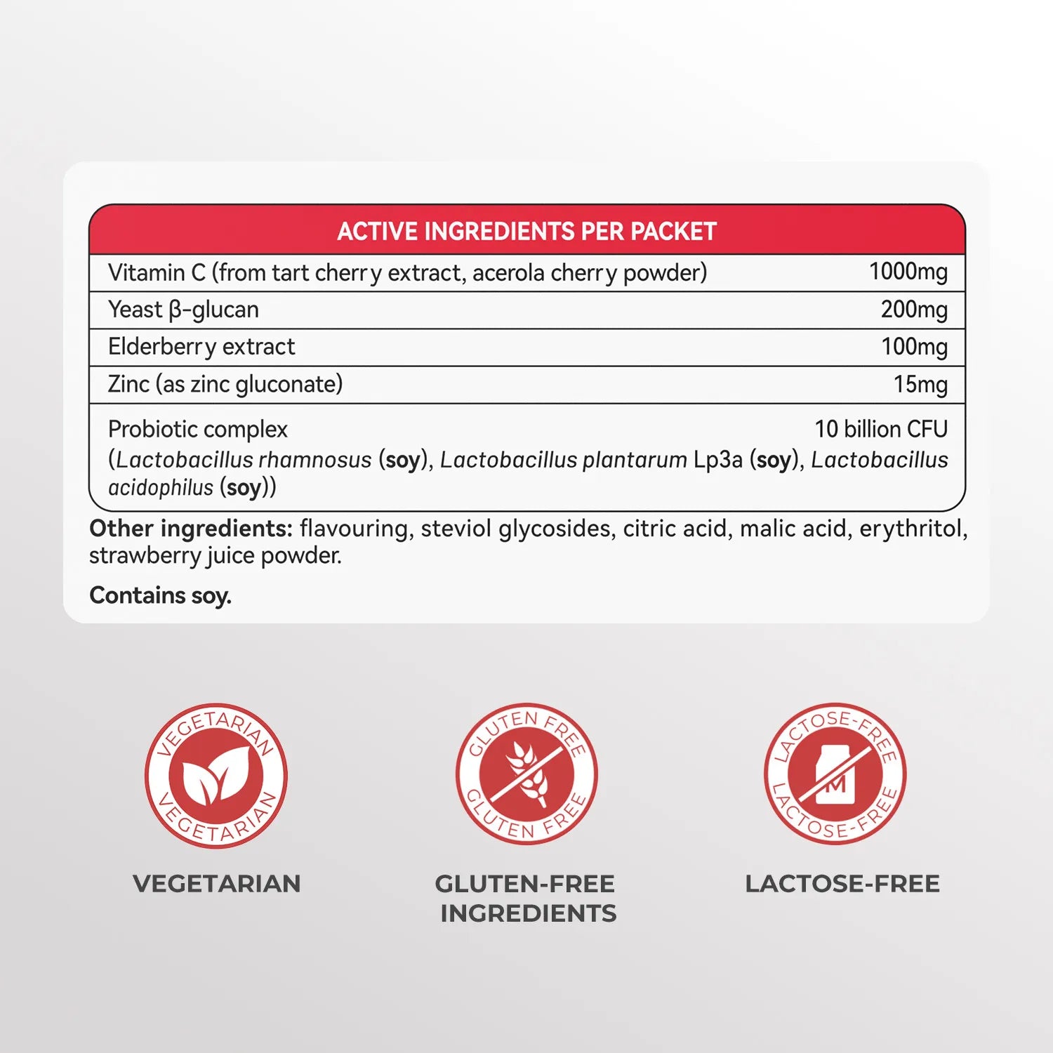 Other ingredients: flavouring, steviol glycosides, citric acid, malic acid, erythritol, strawberry juice powder.
